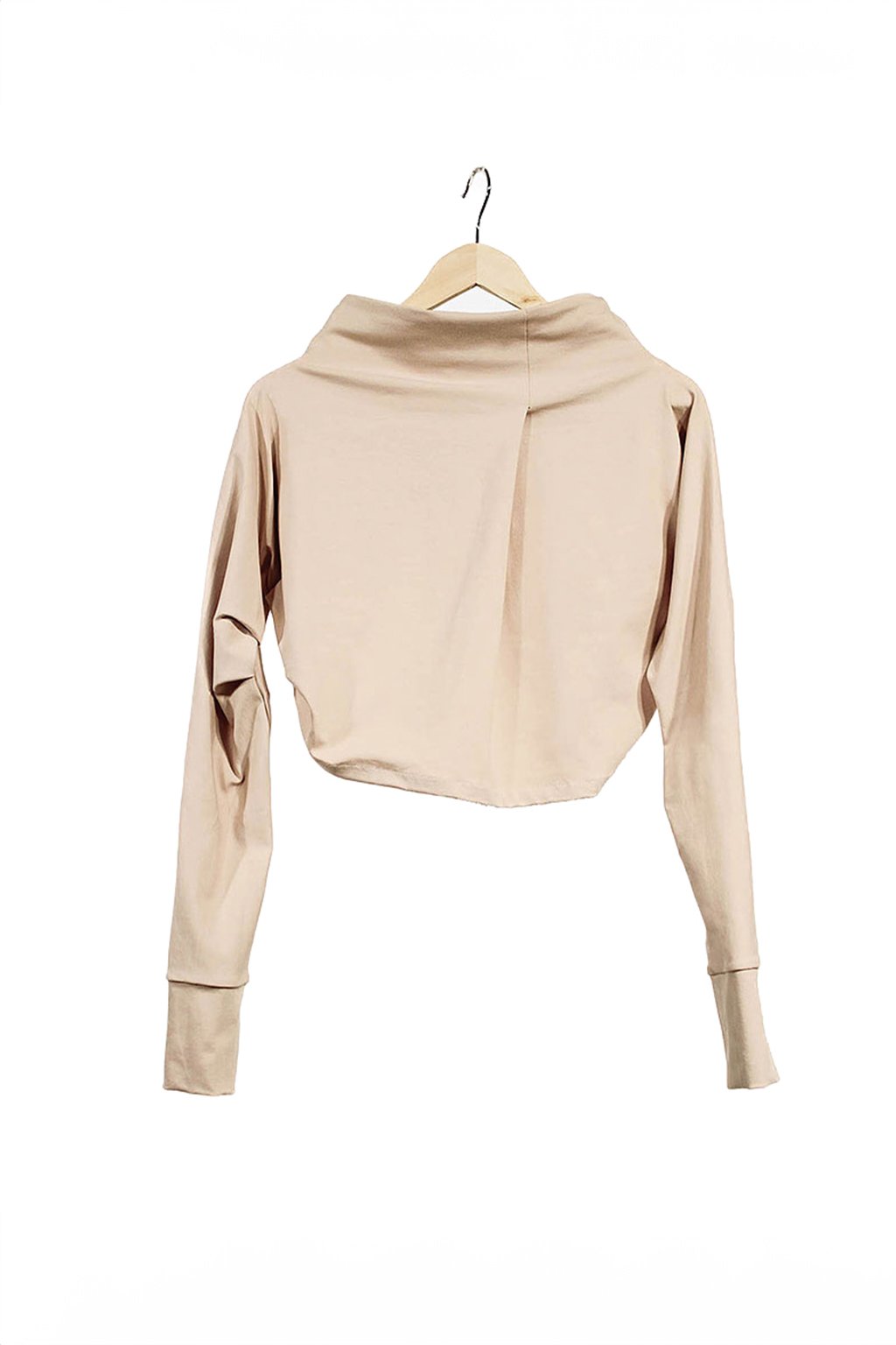 Asymetrické bavlnené bolerko. Jeho jemný, ale výrazný golier a elegantné dlhé rukávy dodajú vášmu vzhľadu sofistikovanosť, zatiaľ čo asymetrický strih dodáva štipku rebelstva. Každý detail je premyslený a ručne spracovaný na mieru, aby ste si mohli vychutnať exkluzívny pocit z nosenia.