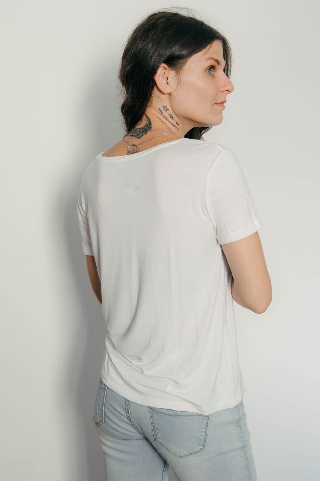 Biely základ trička vytvára čistý priestor pre kontrastnú výpoveď. Padavý strih z viskózy je pohodlný, ženský a vhodný na každý deň, keď sa rozhodneš neuberať. Len byť.