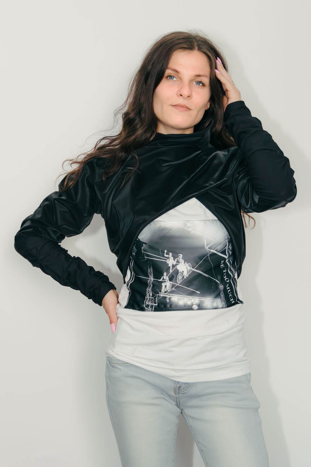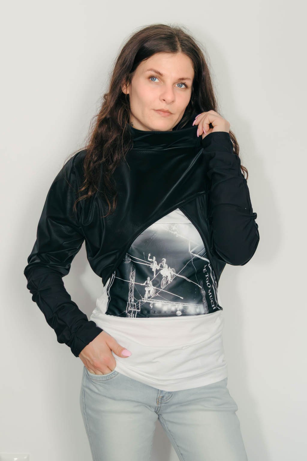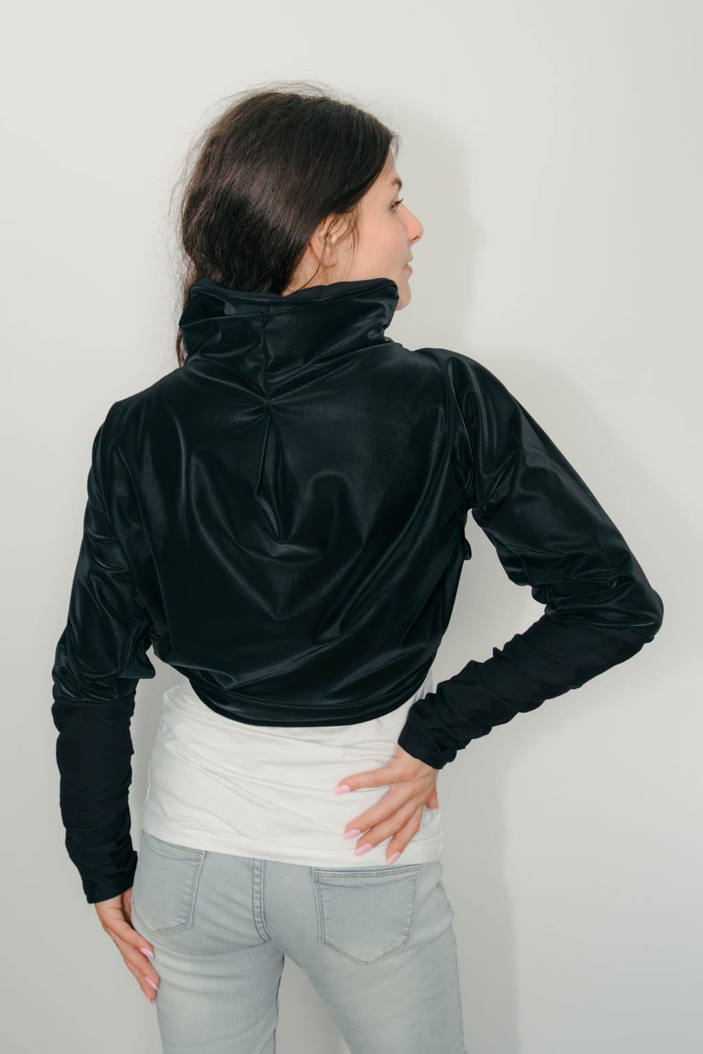 Funkčné a štýlové čierne bolero s vysokým golierom a prekríženým predným dielom. Ideálne ako vrchná vrstva na umelecké tričká, tielka, topy alebo šaty. Jednoduchý spôsob, ako dodať outfitu yaujímavejší výraz.