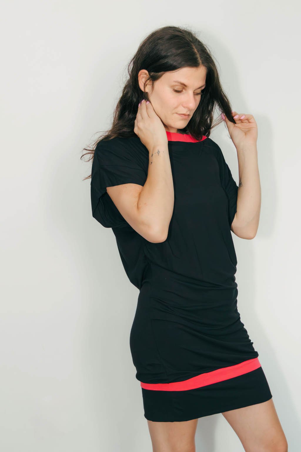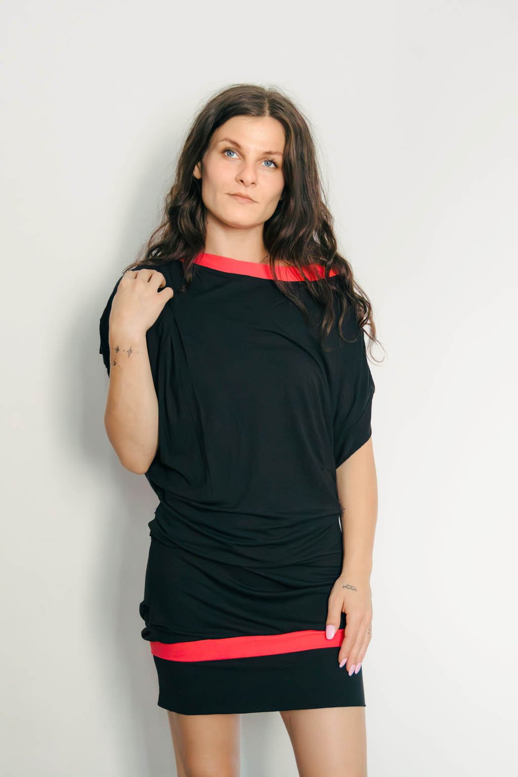 Tieto šaty sú stelesnením kontrastu – medzi jemnosťou a odvahou, medzi komfortom a výpoveďou. Vyrobené z ľahkej viskózy s elastanom, poskytujú voľnosť pohybu a príjemný dotyk na pokožke. Červené lemovanie na čiernom podklade vytvára výrazný vizuálny prvok, ktorý pôsobí hravo, no zároveň elegantne.