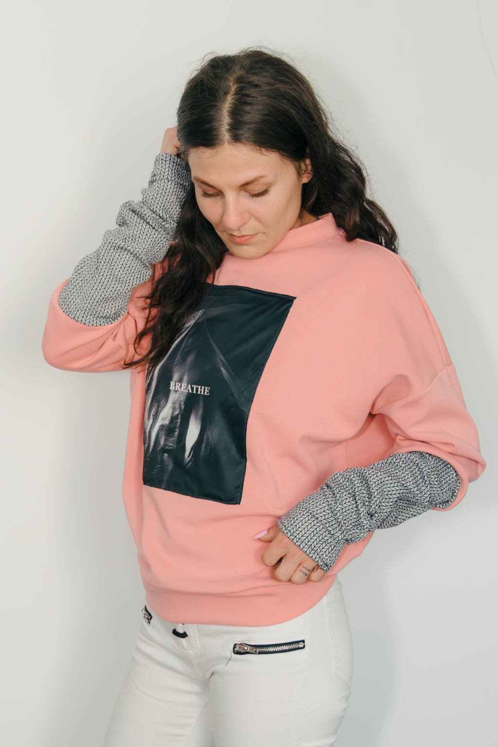 Ružový základ kontrastuje s tmavými, štruktúrovanými rukávmi a jemným stojačikom, ktorý zahreje bez toho, aby pôsobil príliš športovo.