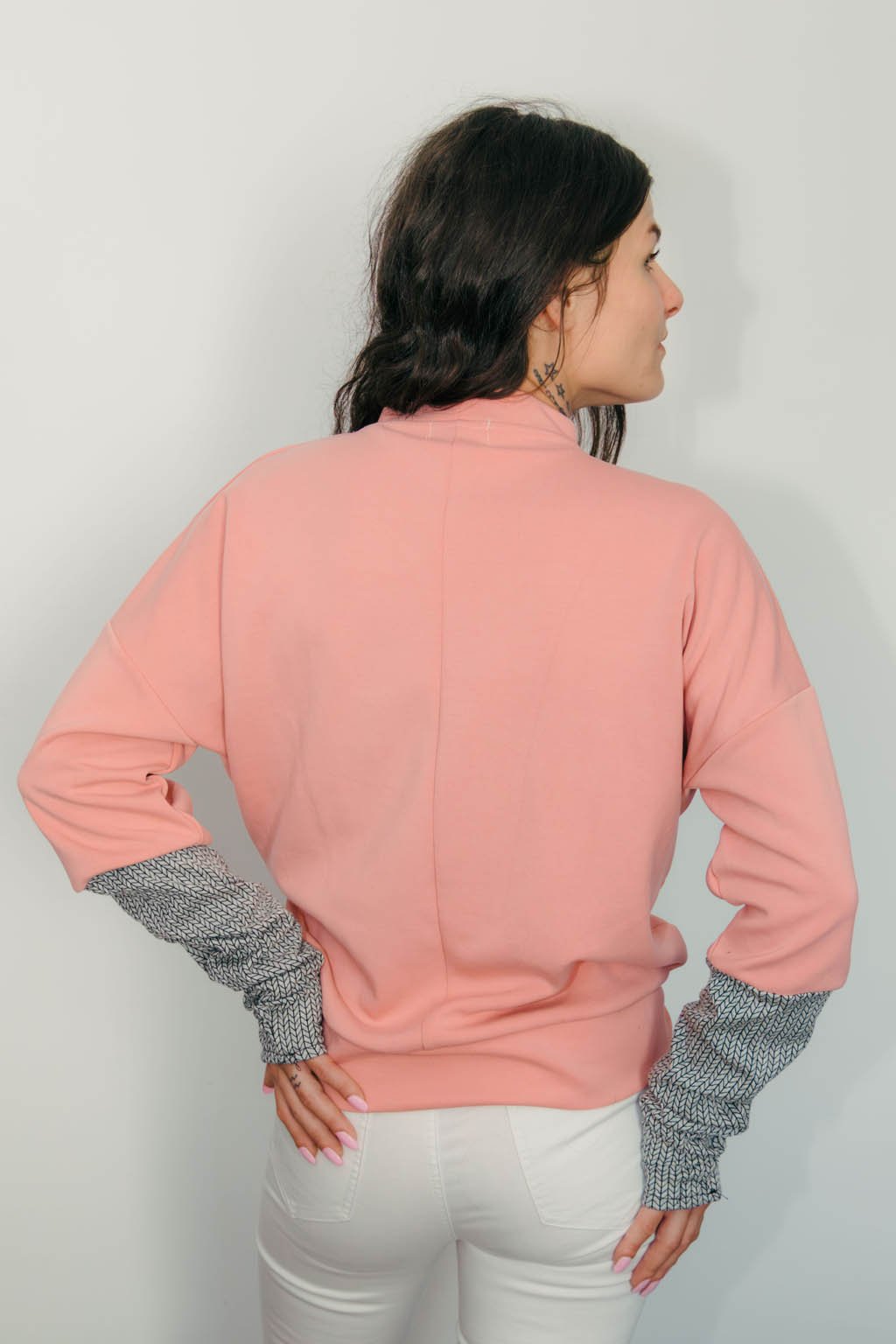 Jemný lososový odtieň s kontrastnými rukávmi