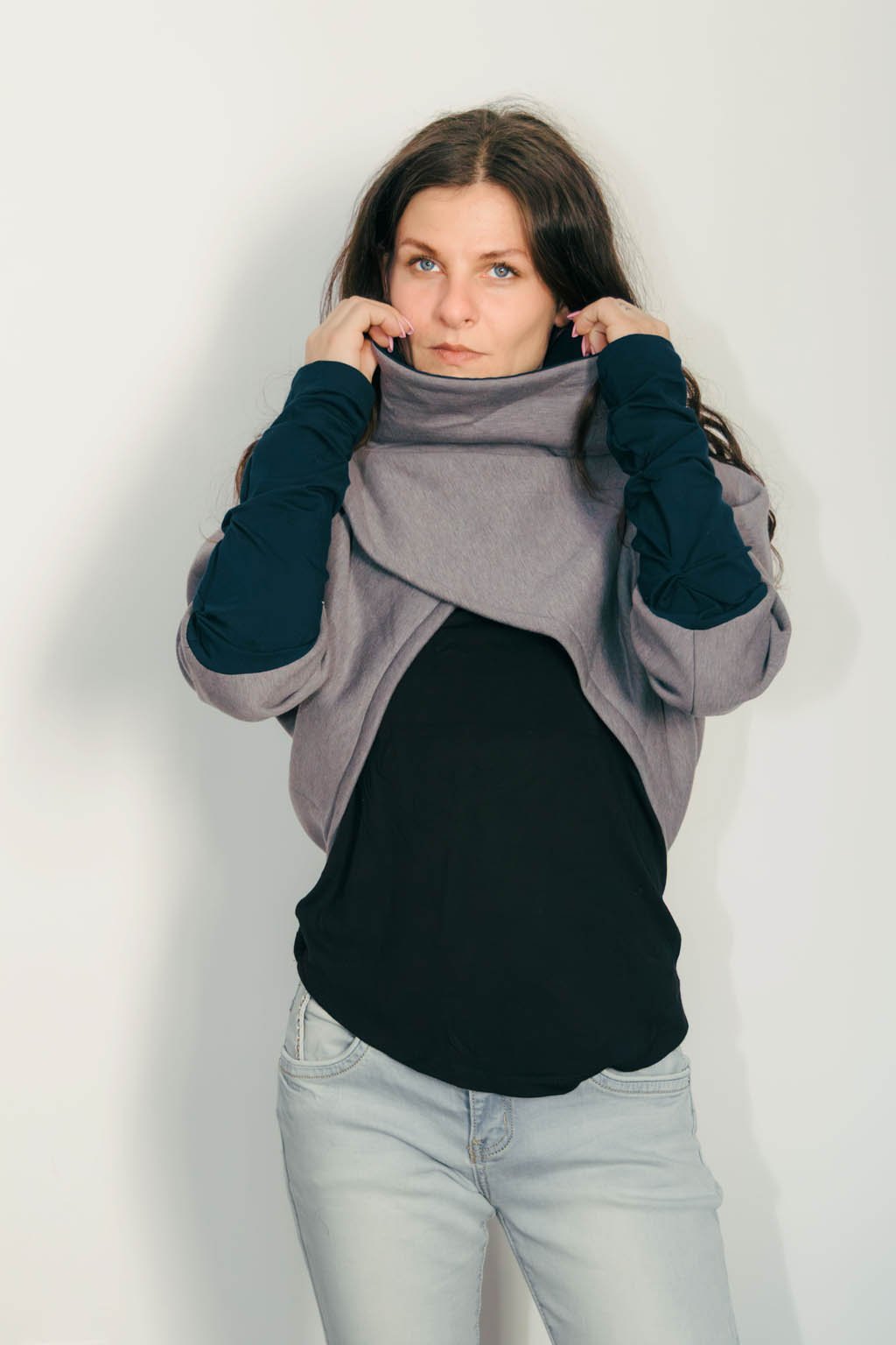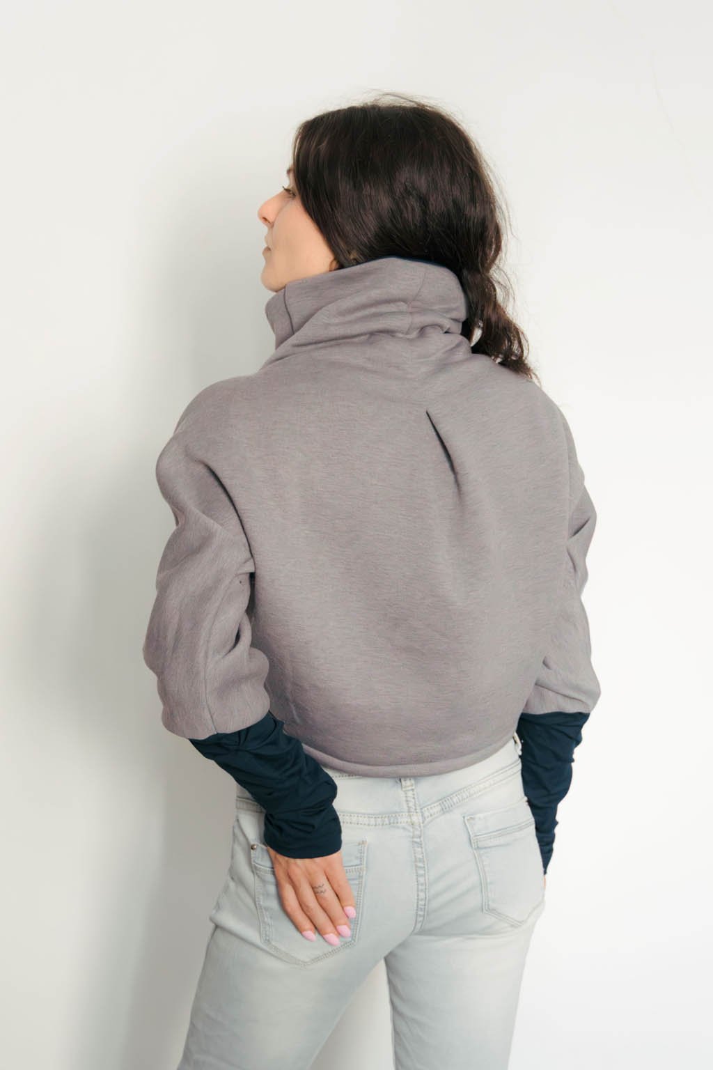 Nepočesaná teplákovina je príjemná na dotyk, stredne hrubá. Strih je asymetrický, tvarovaný tak, aby obopínal ramená, ale ponechával priestor na pohyb.