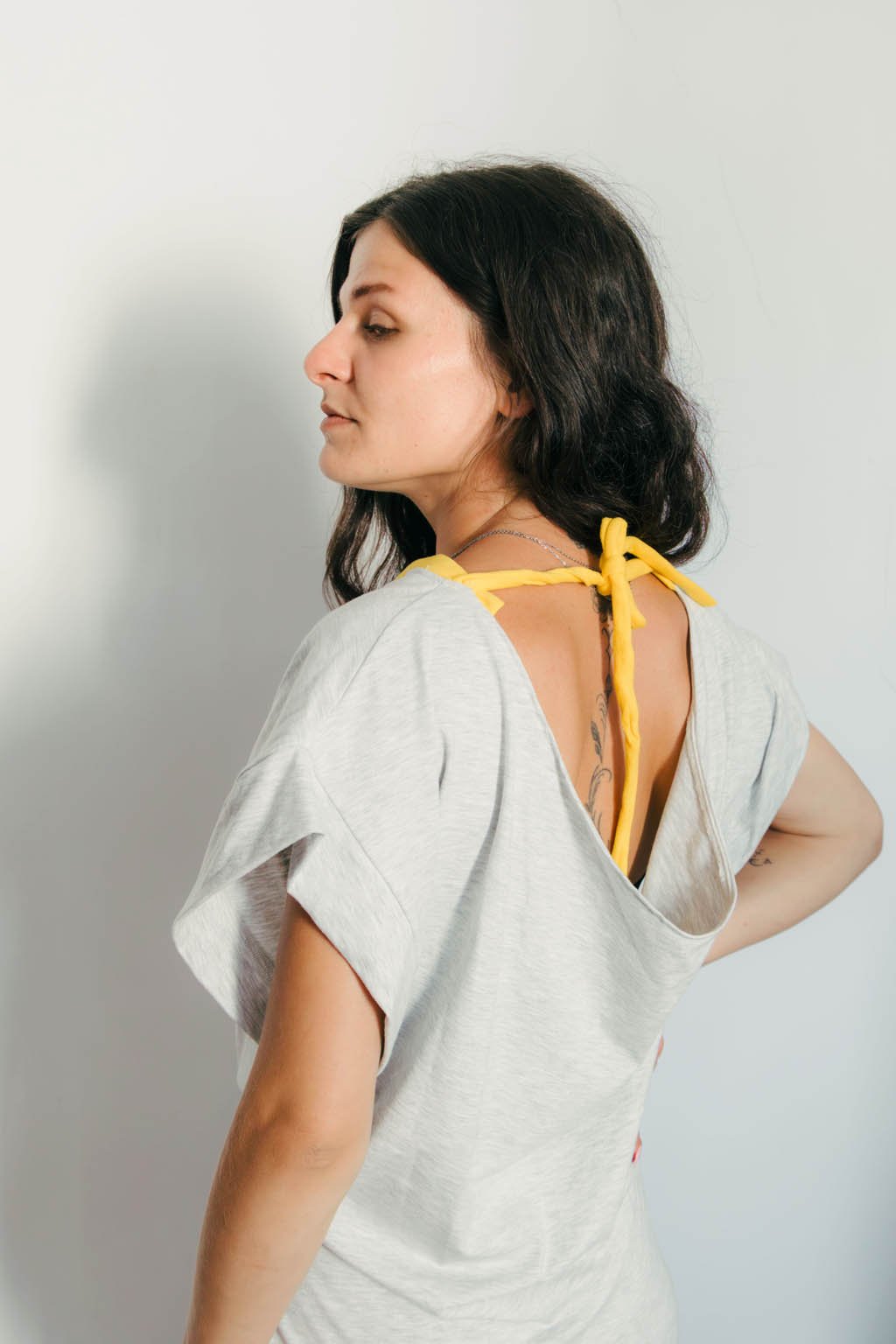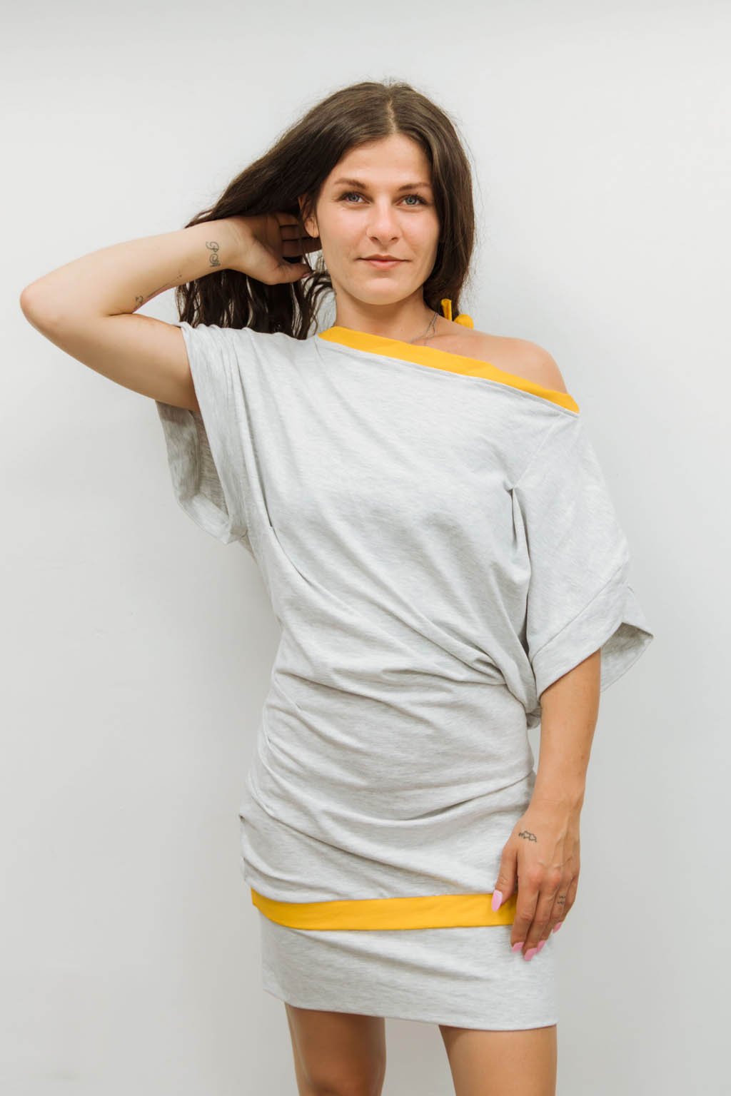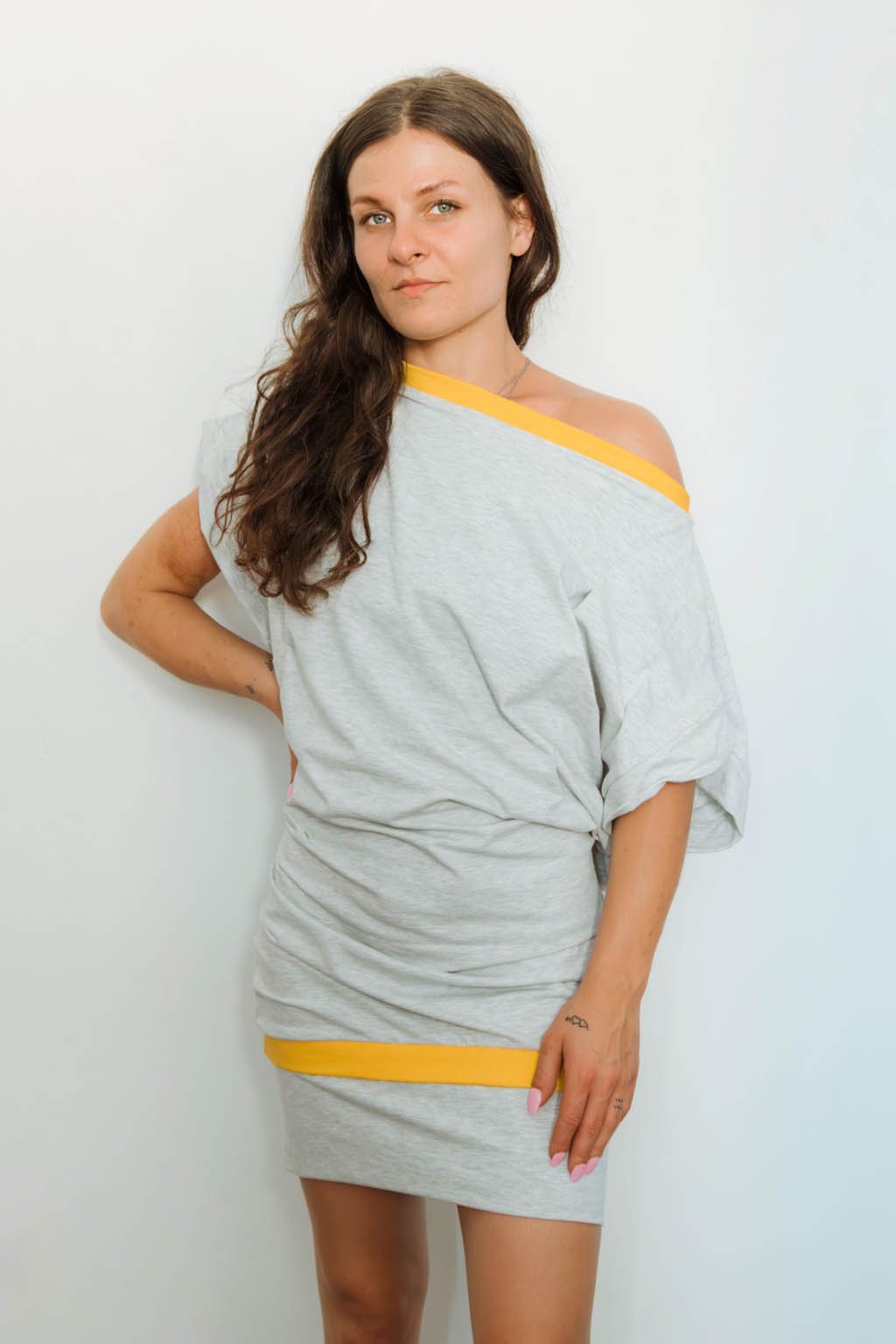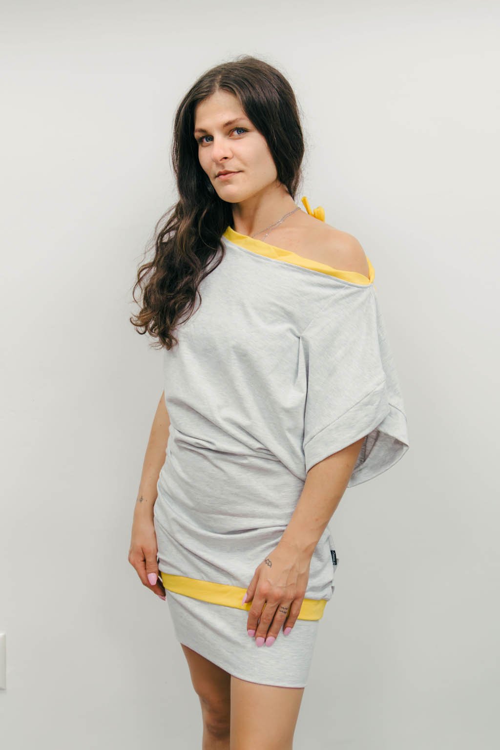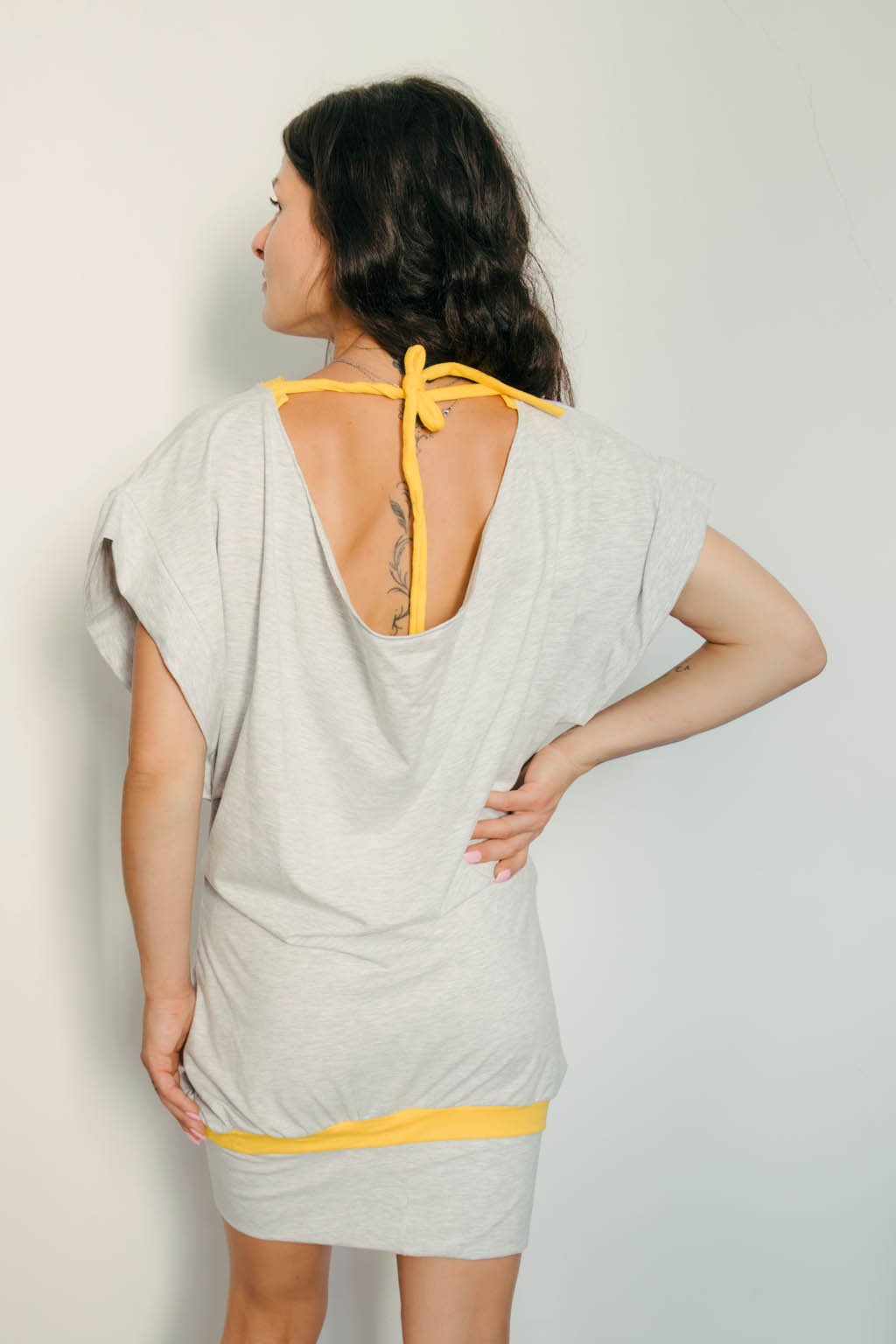 Voľný strih krásne padá cez ramená, odhaľuje ich s prirodzenou nedbalosťou a necháva vyniknúť váš vlastný štýl. Zadný výstrih sa decentne viaže žltou šnúrkou, ktorá farebne ladí s kontrastným lemom na spodku šiat aj pri výstrihu. Vďaka elastanu sa šaty jemne prispôsobia postave, ale vždy zostávajú pohodlné.